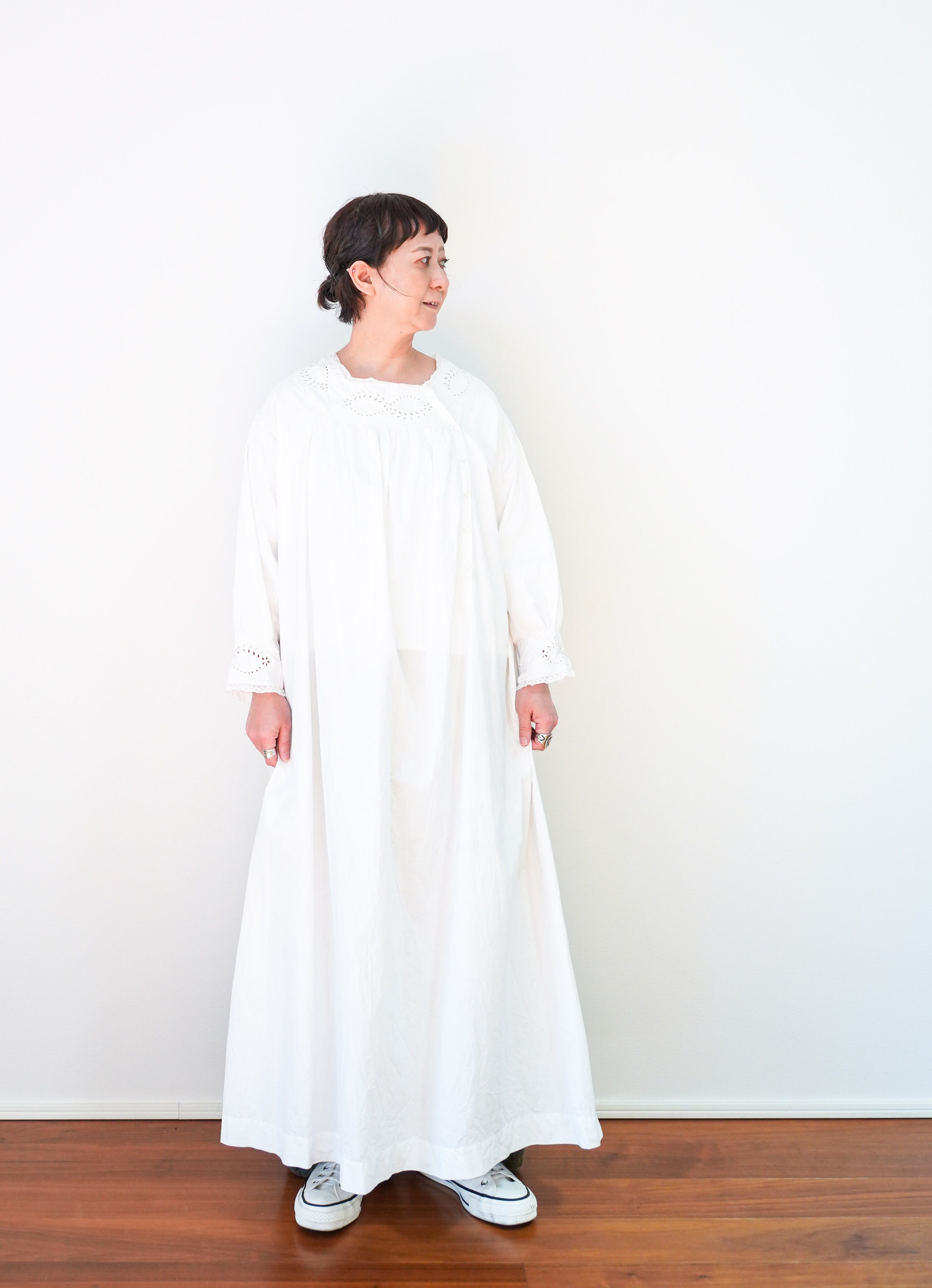 何といっても首回りと袖口の繊細なレースに惹かれます。生地がとても軽くゆったりとしているため色々楽しめてインナーにTシャツやタートルを着てカーディガンやストールを巻いてもかっこいいです。