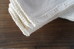 生成りのレースとステッチが繊細なクロスです。カトラリーを上に置いたり、花瓶の下にひいたりとディスプレーしてもいいです。お茶の時間を楽しむためにクロスの上にカップを置いてTea Timeの際にお使いいただけます。