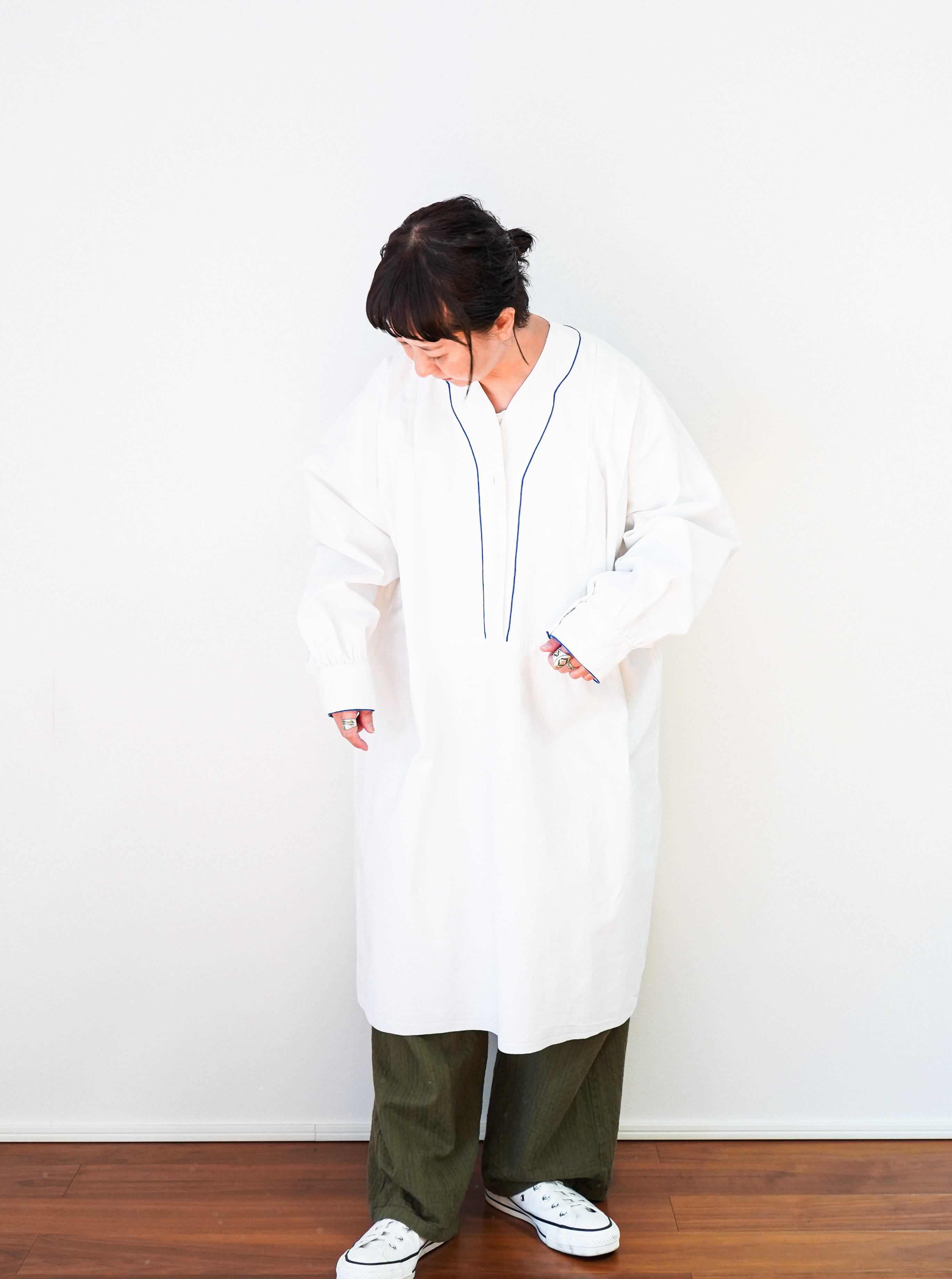 BLUEのステッチとVネックに惹かれました~。上からストールをざっくり巻いても可愛かったです。そして太めのダルダルなパンツ!かわいいです。コンビにハイカットスニーカーいかがですか?
