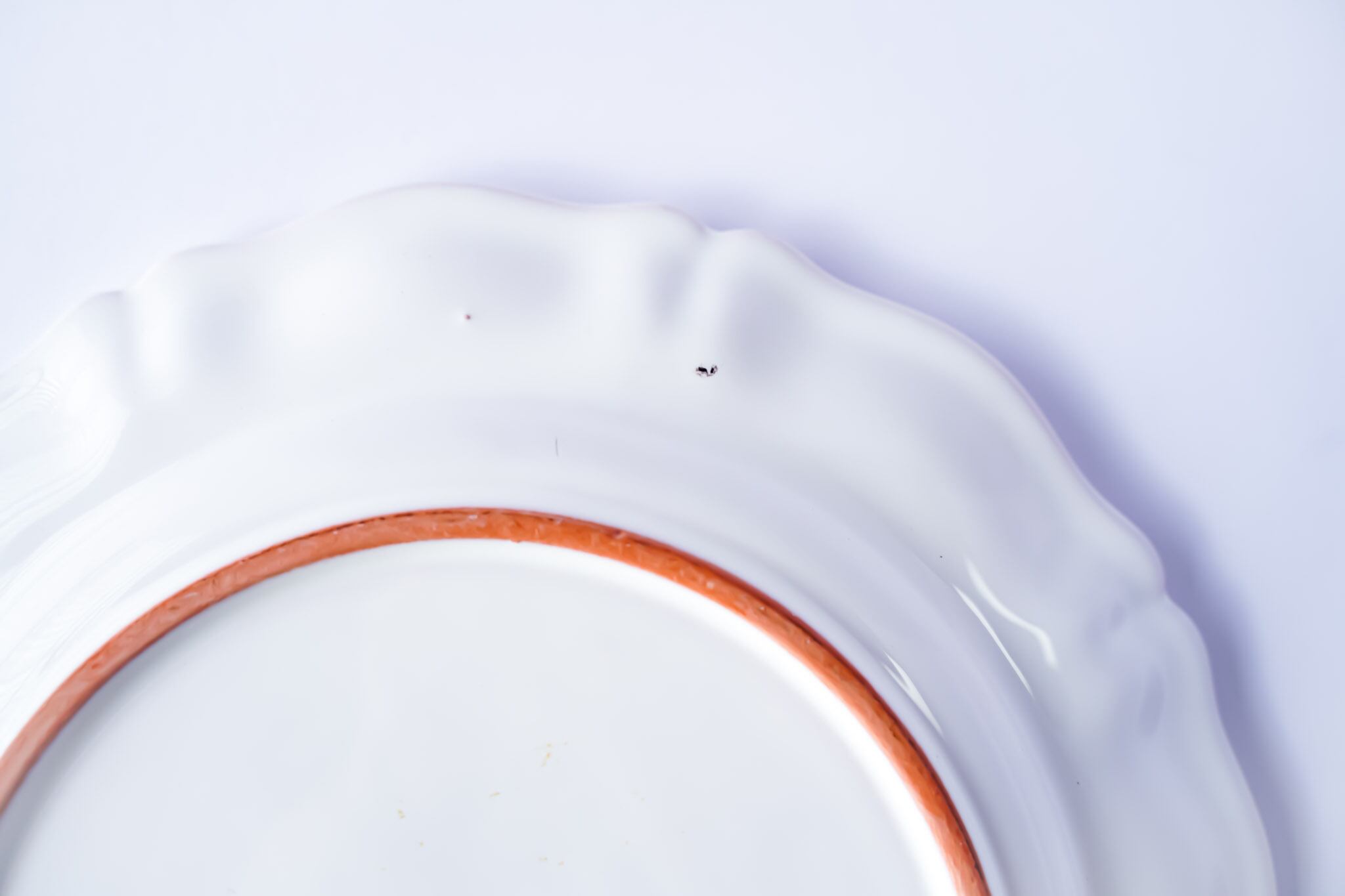 肉厚のエッジにはラインが入っており上から見ても、横から見てもいいです。大きさはΦ26cmで内寸が18cmあります。ディナープレートととしてパスタ・お肉・おさかな料理にもちょうどいい大きさです。プレートの後ろには手書きサインがされています。プレートの裏側の薄い茶色はお皿をディスプレーされていた時の金具の塗料です。輝きも良く、長い間大切に綺麗に飾られていたようすがわかりますね。こちらのプレートはフランスから直送してもらいました。