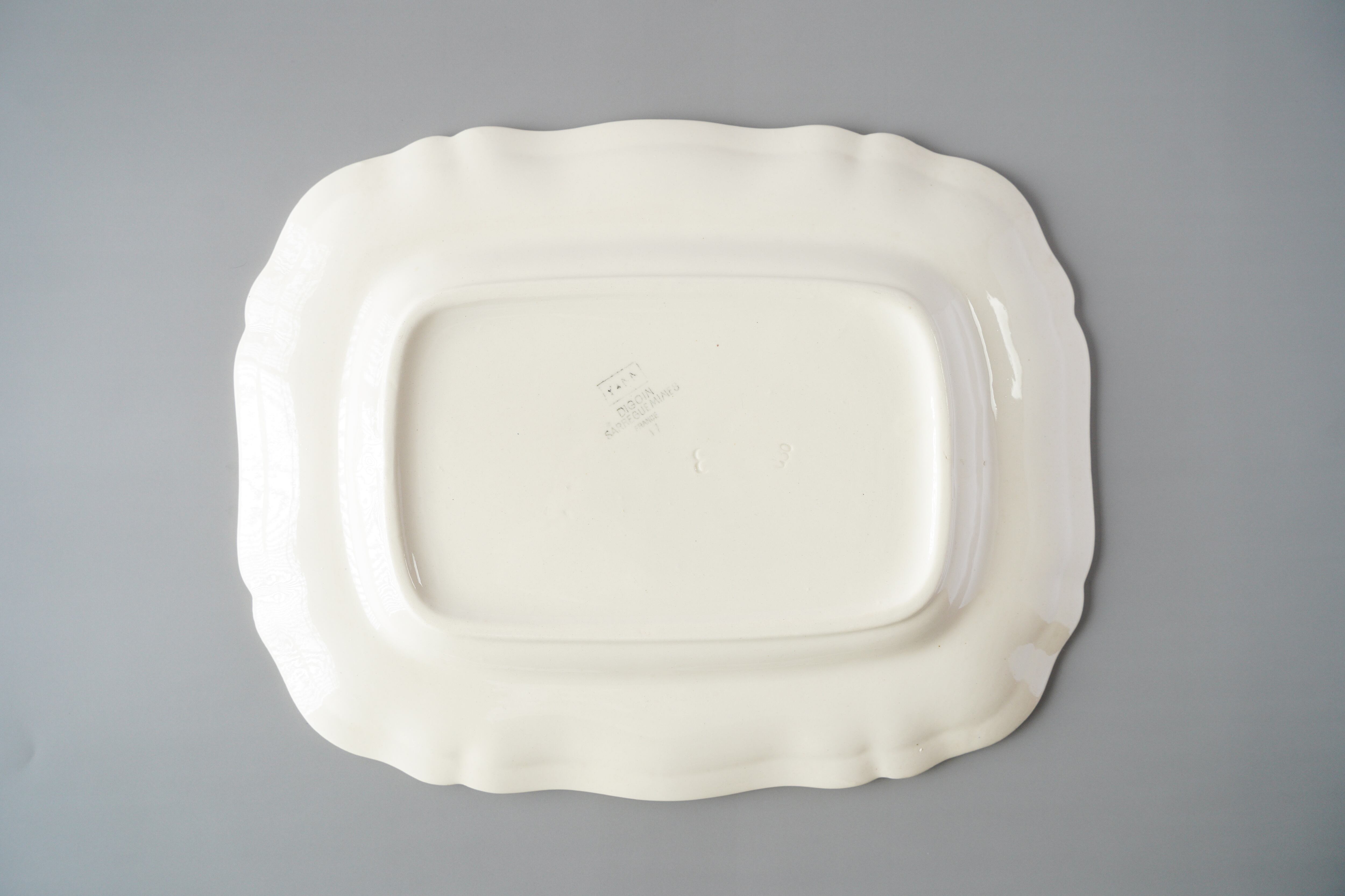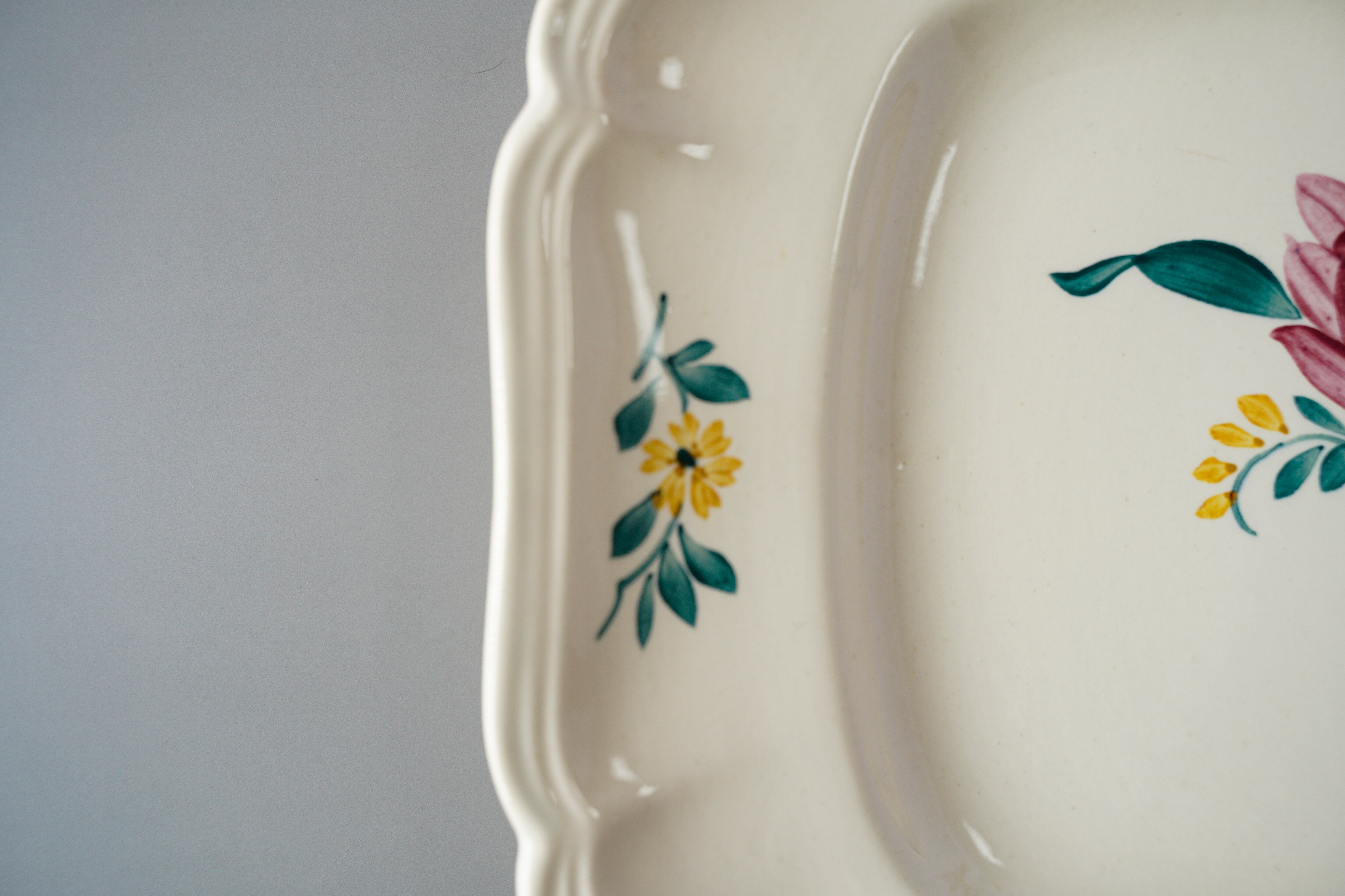 おおきなサルグミンヌのプレートはYannシリーズは手書きの装飾の色合いが柔らかい感じのスクエアープレートです。エッジの曲線は品もあり年代の美しさが出ています。