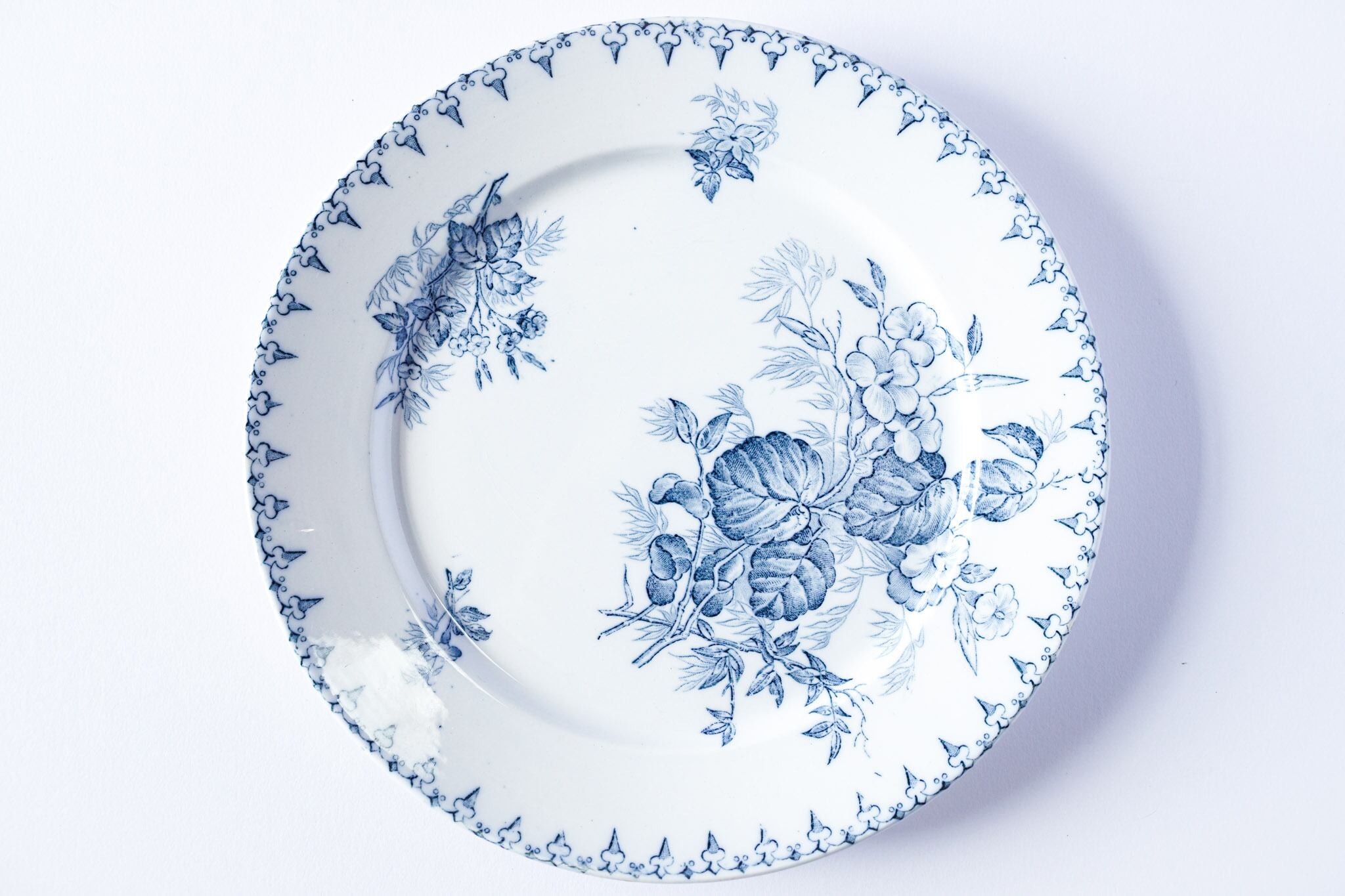 手書きの装飾は一枚ごとに花の描き方が違っていて見入っちゃいます。リムに描かれた模様は花壇の柵に見えます。プレートの裏にはどこの窯で作られたのか、だれが作ったかの記しも入っています。100年以上前にフランスのサルヌミングで作られてモノが縁がありここに来てくれたってありがとう!って気持ちです。