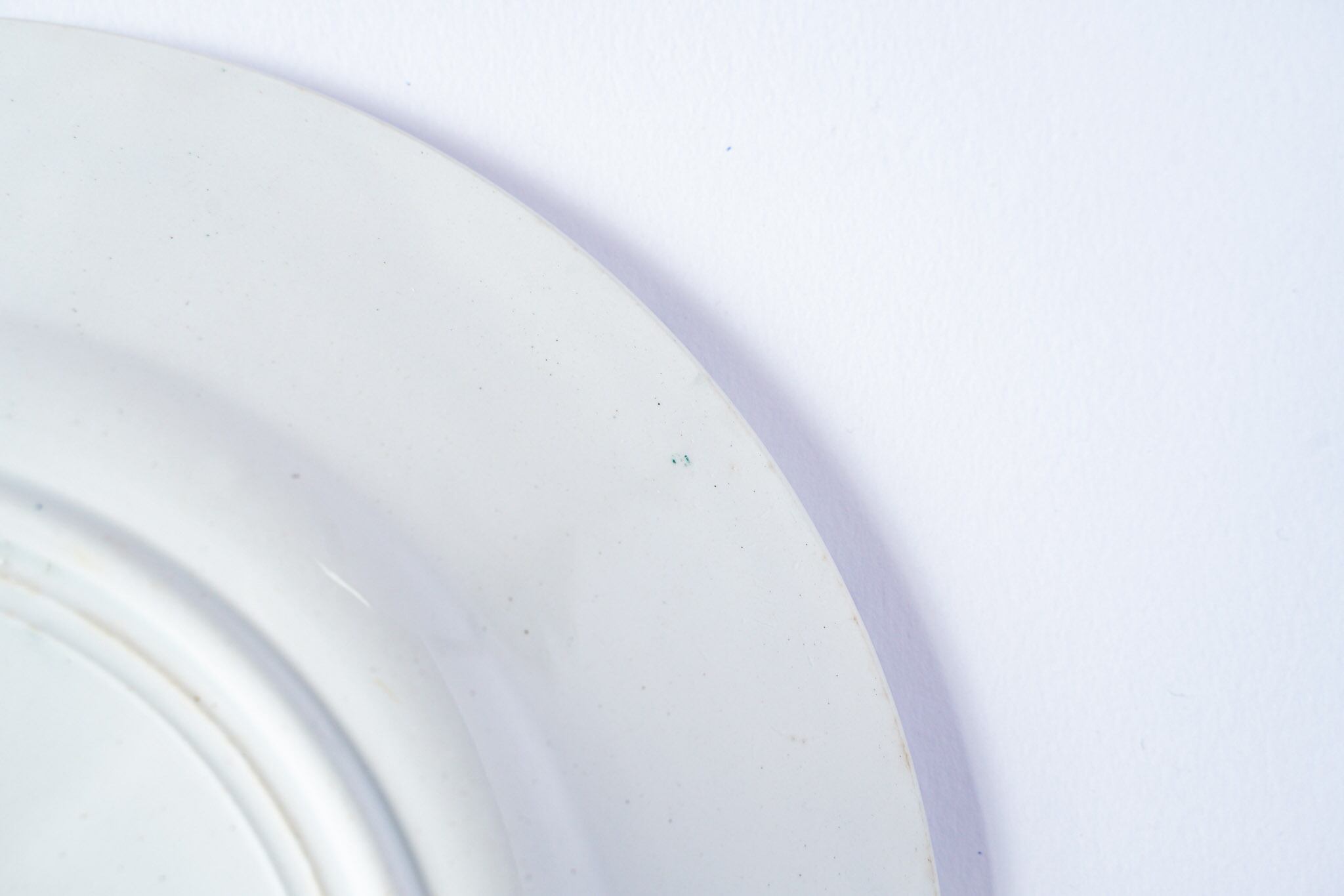 1770年にフランスから始まった技術と言われています。長石・カオリンを混ぜ合わせてより白く、耐性が高められていることが特徴です。プレートの裏のスタンプ近くにある凹みが記しです。とてもいい状態のプレートです。