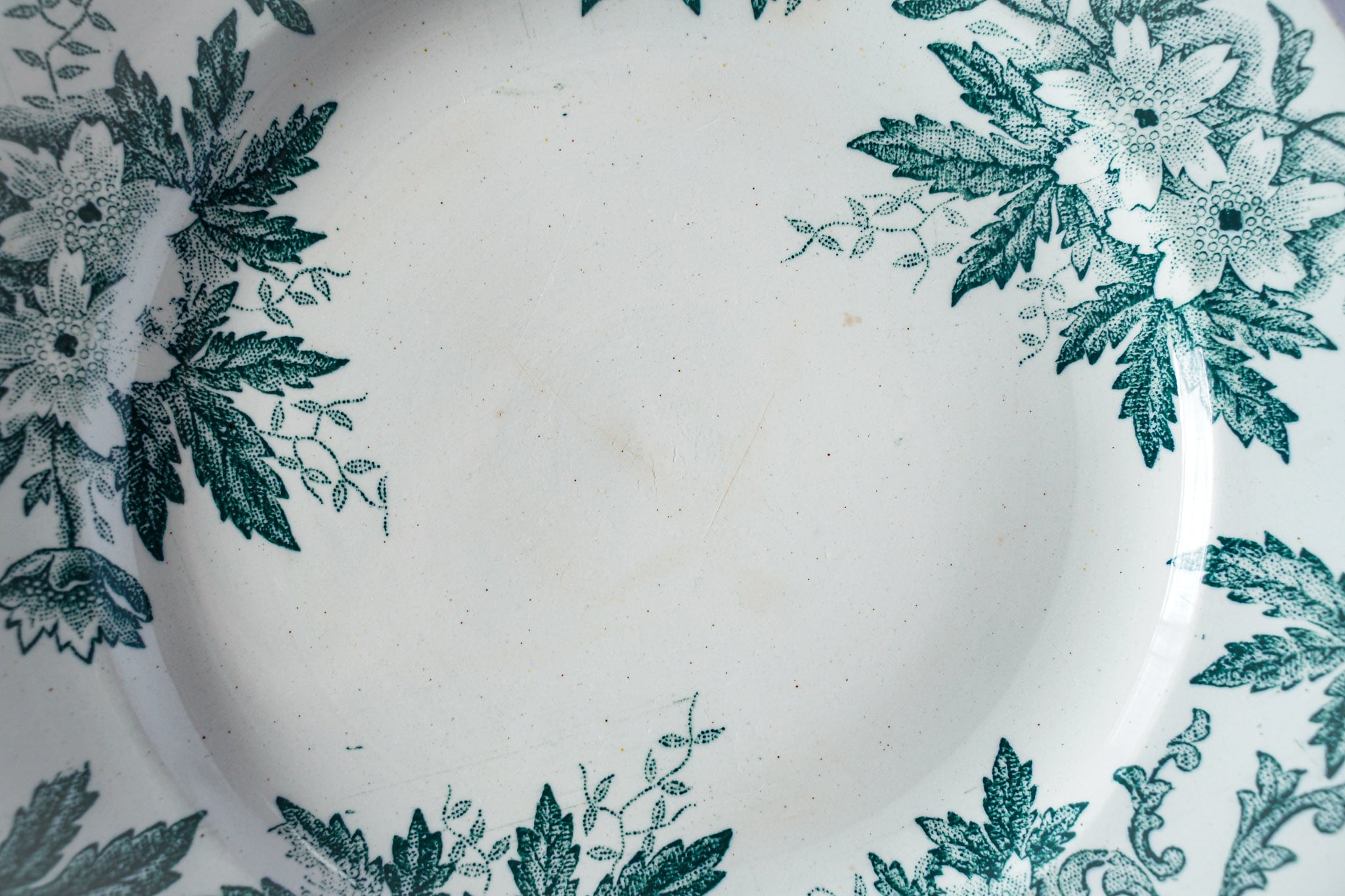 1770年にフランスから始まった技術と言われています。長石・カオリンを混ぜ合わせてより白く、耐性が高められていることが特徴です。プレートの裏のスタンプ近くにある凹みが記しです。とてもいい状態のプレートです。