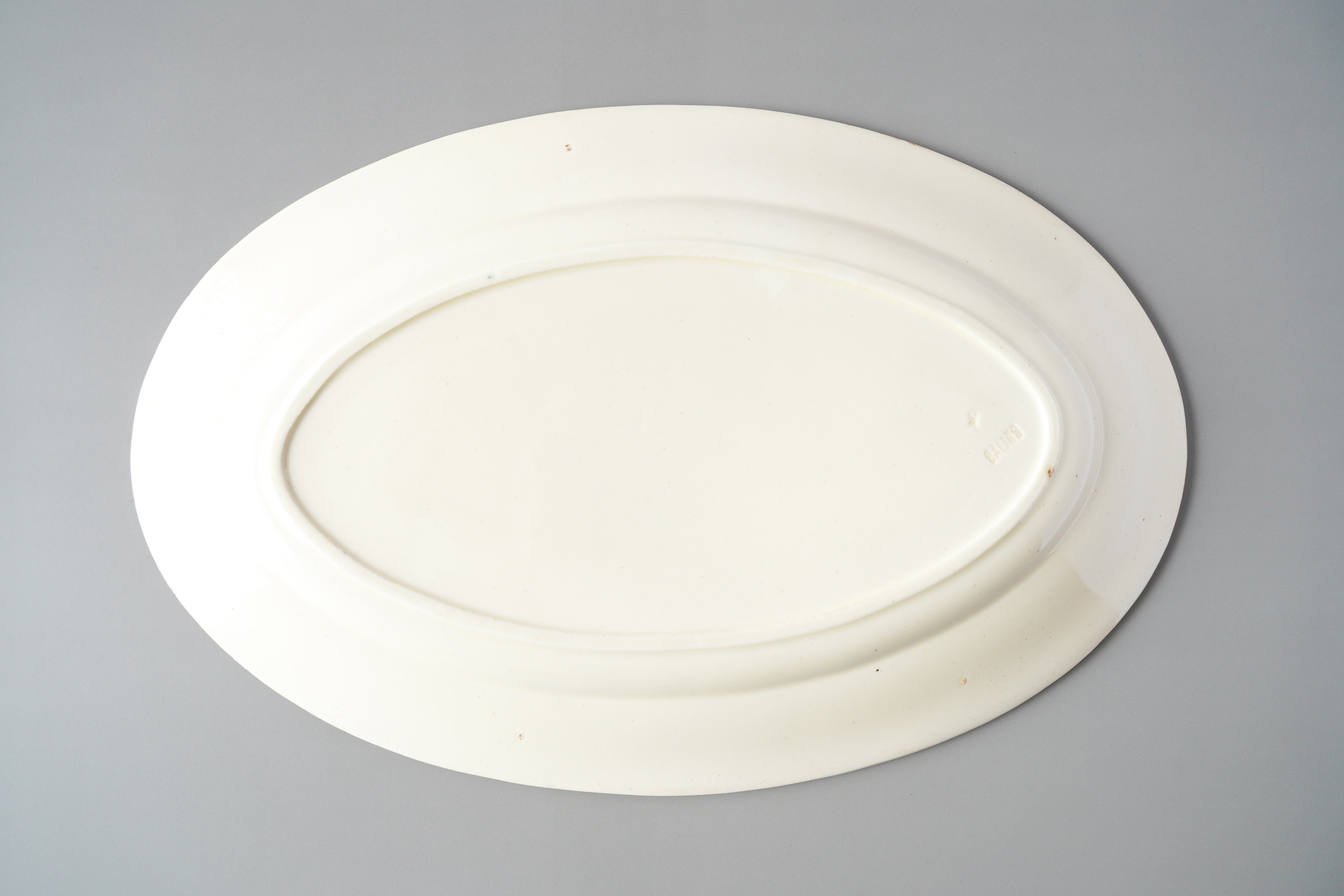 1770年にフランスから始まった技術と言われています。長石・カオリンを混ぜ合わせてより白く、耐性が高められていることが特徴です。プレートの裏の凹みが記しです。とてもいい状態のプレートです。