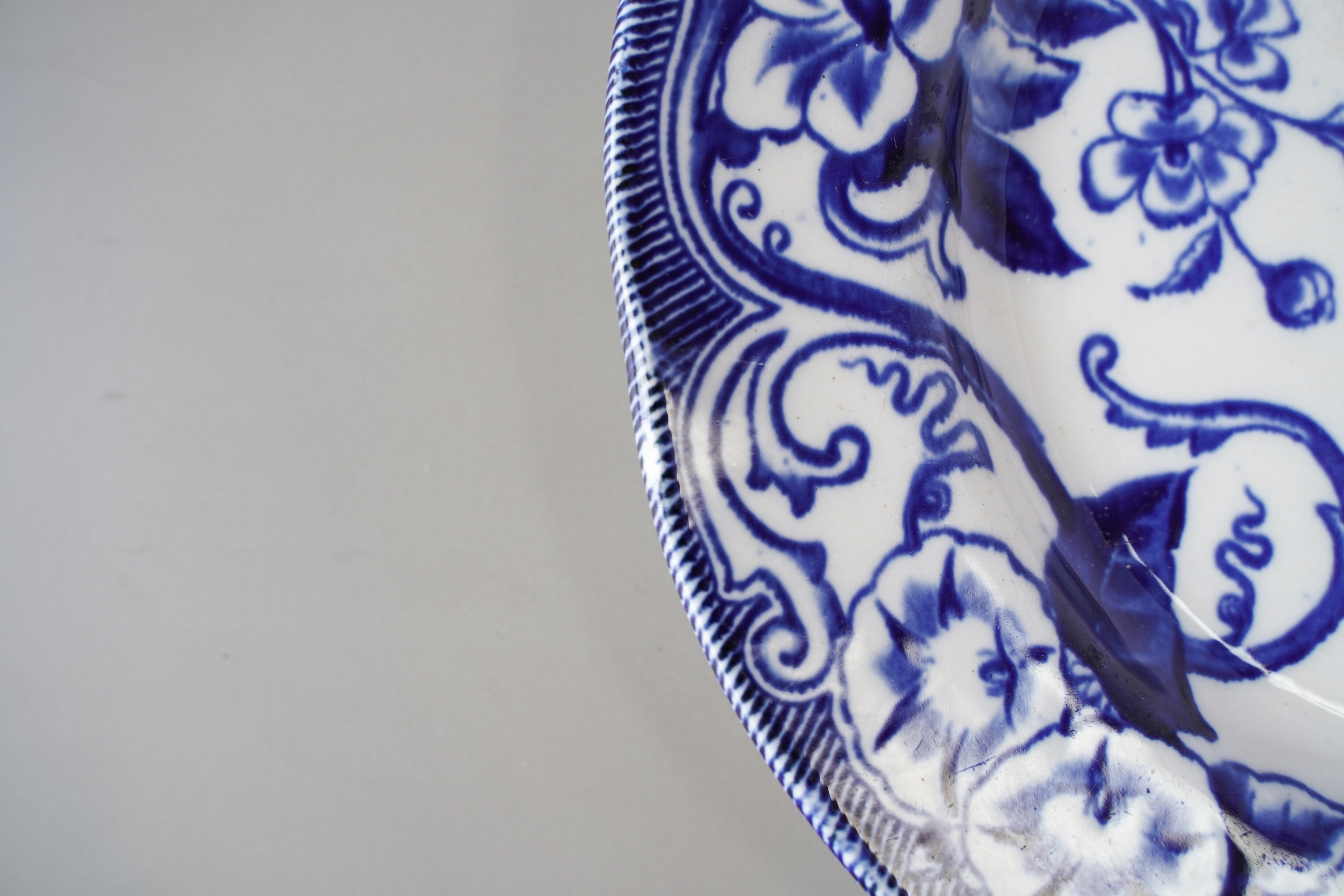 大胆に描かれた花の装飾に、綺麗な濃紺の釉薬が使われたプレートです。