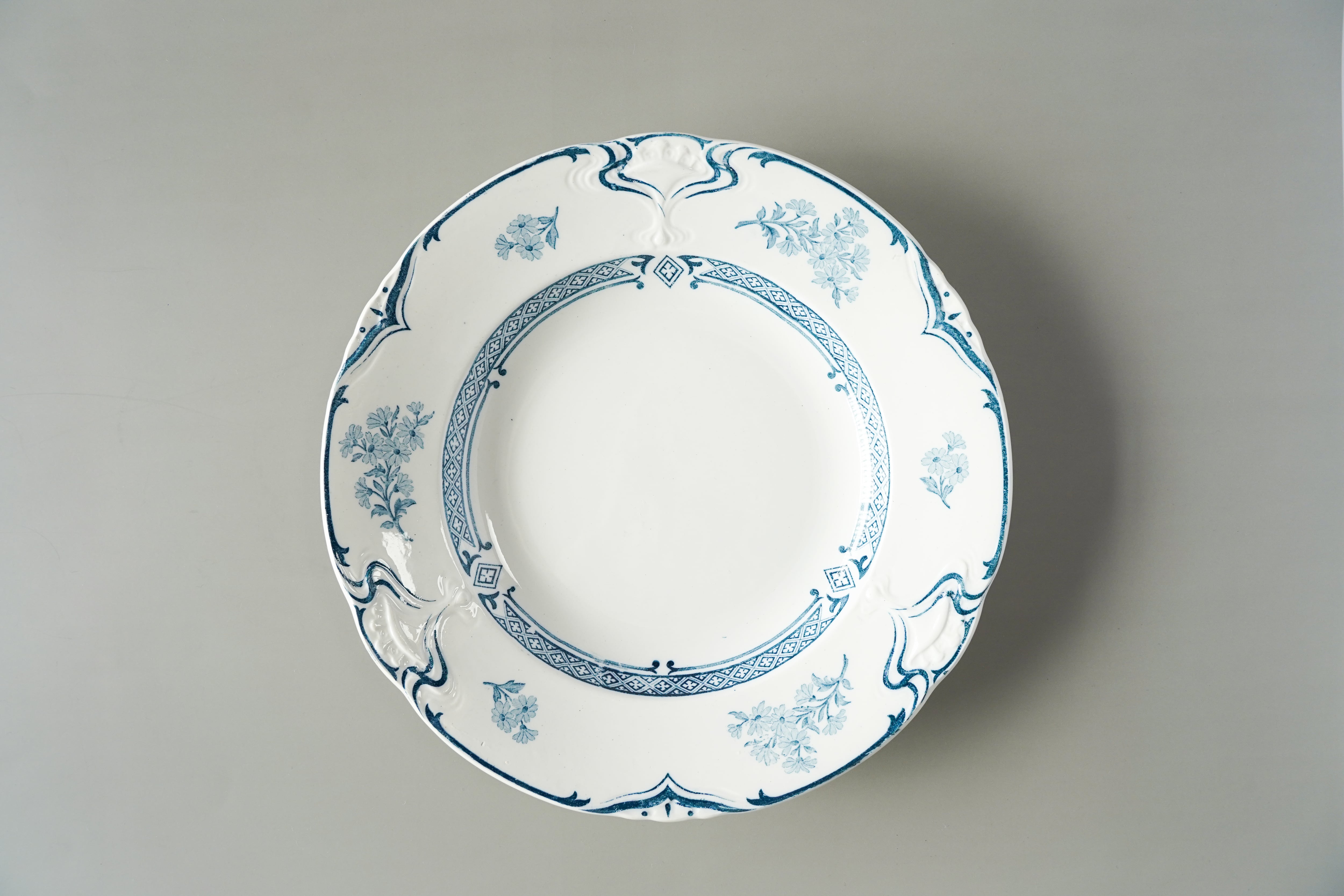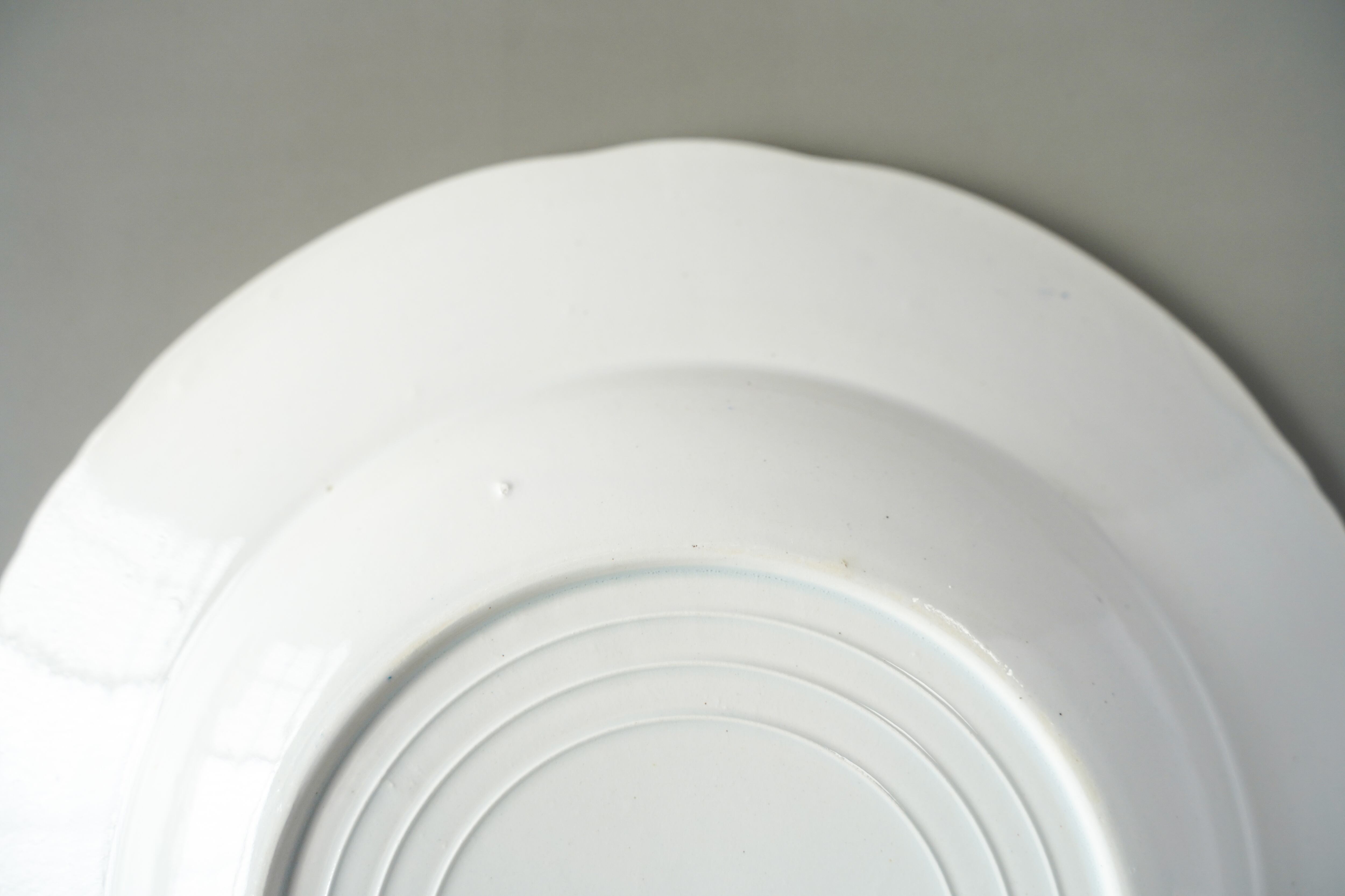 肉厚のしっかりとしたプレートは、じっくり見ると花の装飾以外に陶器の凹凸でフラワーベースのような装飾が形成されています。デザインが凝っているプレートは少し青みがかったようなきれいな白色です。